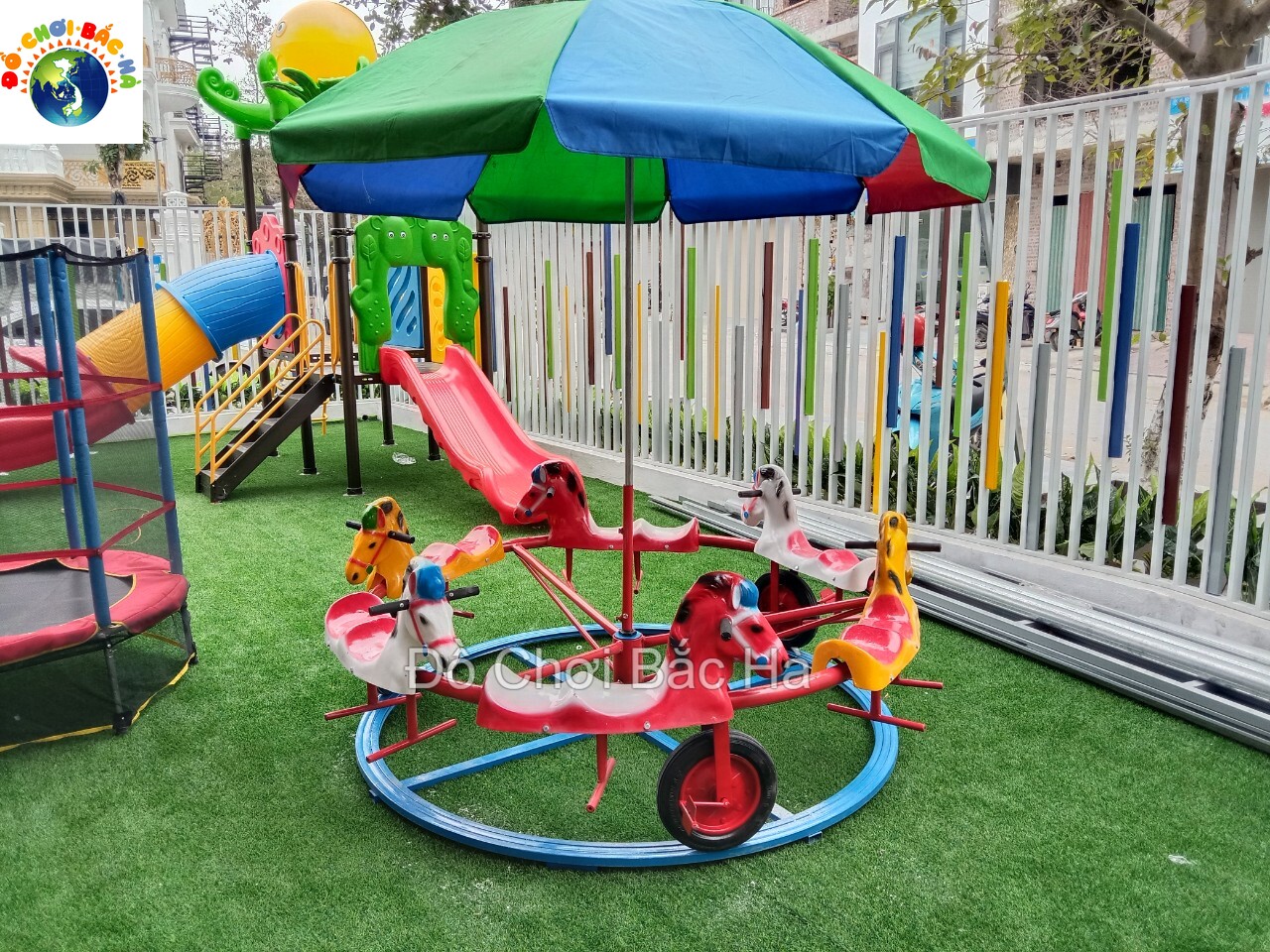 Có 12 chỗ ngồi hình các con giống bằng Composite, 3 bộ chuyền động, có dù che.