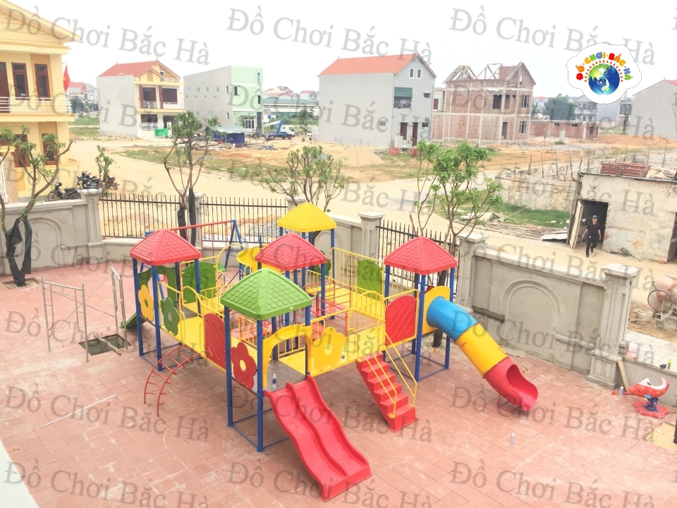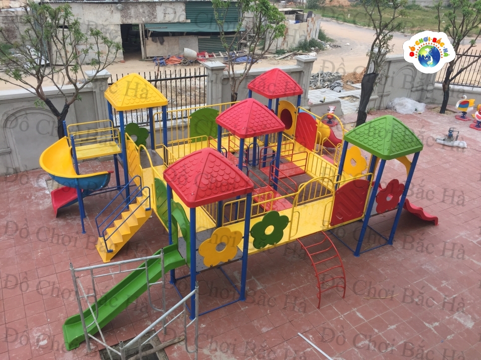 Gồm 5 khối nhà liên kết thành hình vuông. Với nhiều chức năng chơi dành cho nhiều lứa tuổi.Khung bằng sắt, sàn tôn chống trượt. Hệ thống cầu trượt xoắn, ống và cầu trượt thẳng đơn, đôi, cầu trượt sóng, mái, vách ngăn và phù điêu bằng Composite. Đặc biệt có các hình thức thang leo như: thang bò, thang xích, thang bậc và cụm xích đu liên hoàn.