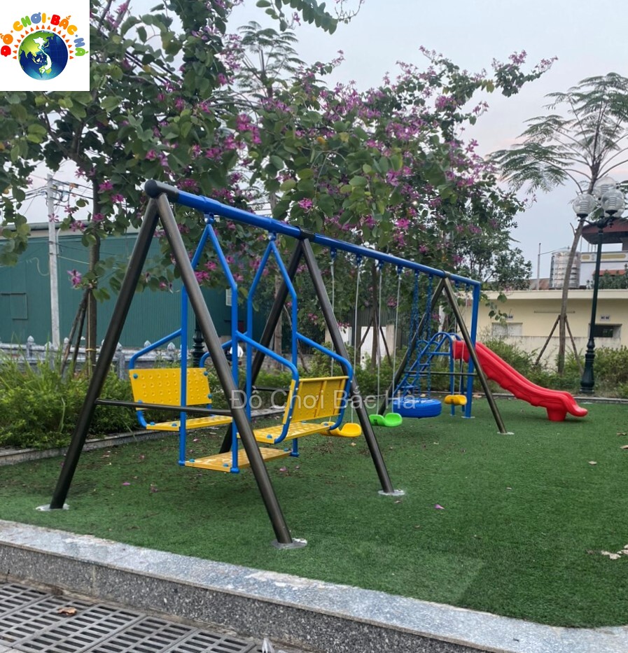 Bản mã chân xích đu Đường kính 20 dày 3mm . Được gắn cố định xuống nền bê tông bằng vít lở sắt loại M100*100mm Đảm bảo an toàn, chống lật cho trẻ khi chơi.