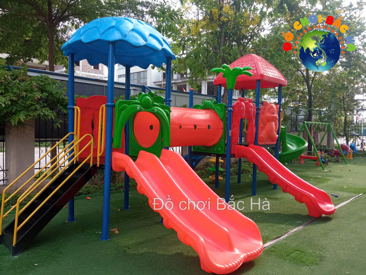 Đây là thiết bị chủ đạo trong sân chơi với hệ thống cầu trượt, thang leo, ống chui, cầu treo... được thiết kế liên kết thành một khối liên hoàn. Cầu trượt liên hoàn giúp trẻ vận động toàn diện, từ leo trèo, trượt xuống, giữ thăng bằng cho đến khả năng phản xạ linh hoạt.