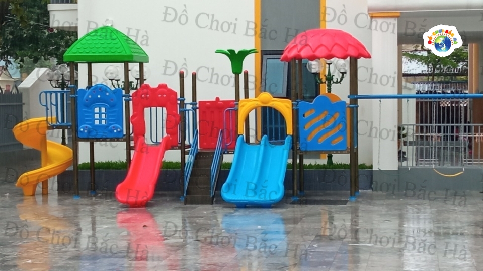 Tất cả các chi tiết của sản phẩm được bắt với nhau bằng ốc âm cột và cùm kẹp chuyên dụng đảm bảo thẩm mỹ và an toàn cho trẻ. Chân cột được gắn đế gang có ma sát để đảm bảo không bị xê dịch khối nhà khi trẻ em chơi. Sản phẩm còn có các chi tiết mái, cầu trượt, vách ngăn, phù điêu và trang trí hình hoa được làm bằng nhựa HDPE nhập khẩu, giúp sản phẩm có độ bền cao và đẹp mắt.