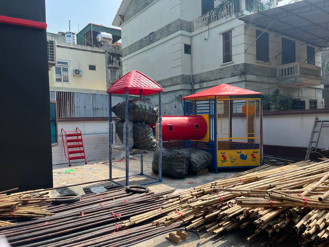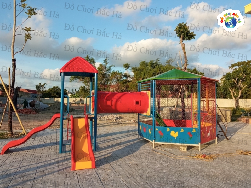 Hình lục giác, khung thép ống, sàn bằng tôn trải thảm, có mái che bằng tôn. Cầu trượt bằng Composite, có thang leo trèo và 02 bảng ném bóng rổ. Nhà chòi khung thép ống f90 – 1,4mm sơn tĩnh điện, có mái, 2 CT và 1 |