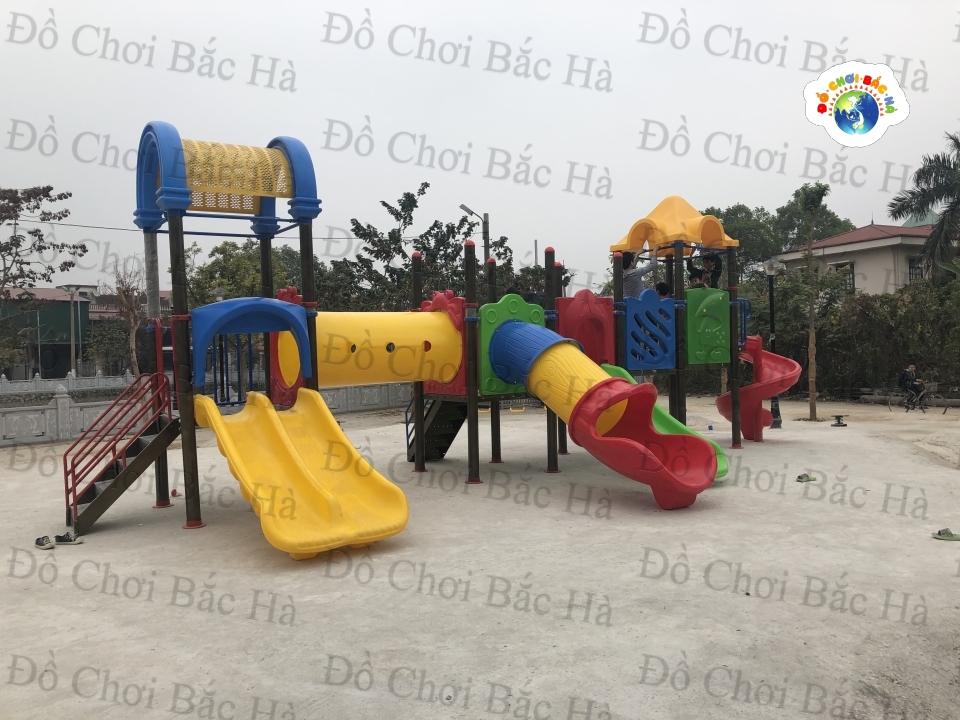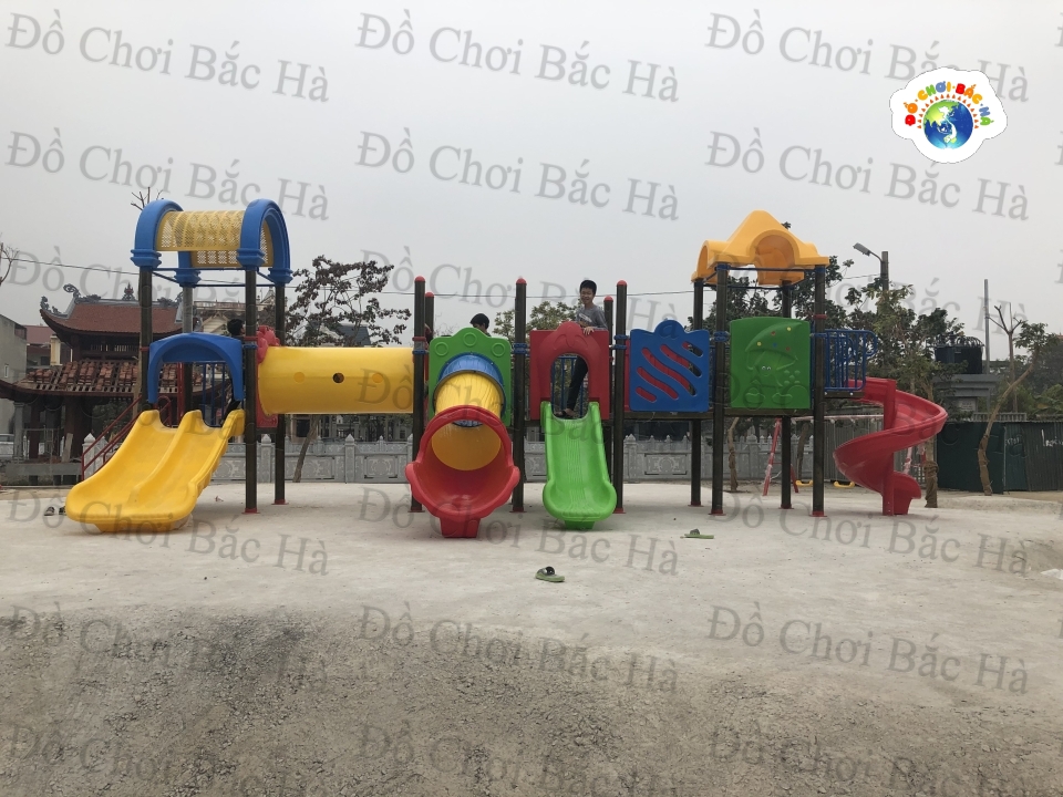 Cầu trươt ống: Cầu trượt ống có 3 màu xanh, đỏ, vàng. Chiều dài cầu trượt ống là 3,3 m, lòng ống có đường kính 60 cm. Chiều cao từ mặt đất lên sàn cầu trượt là 1 m.