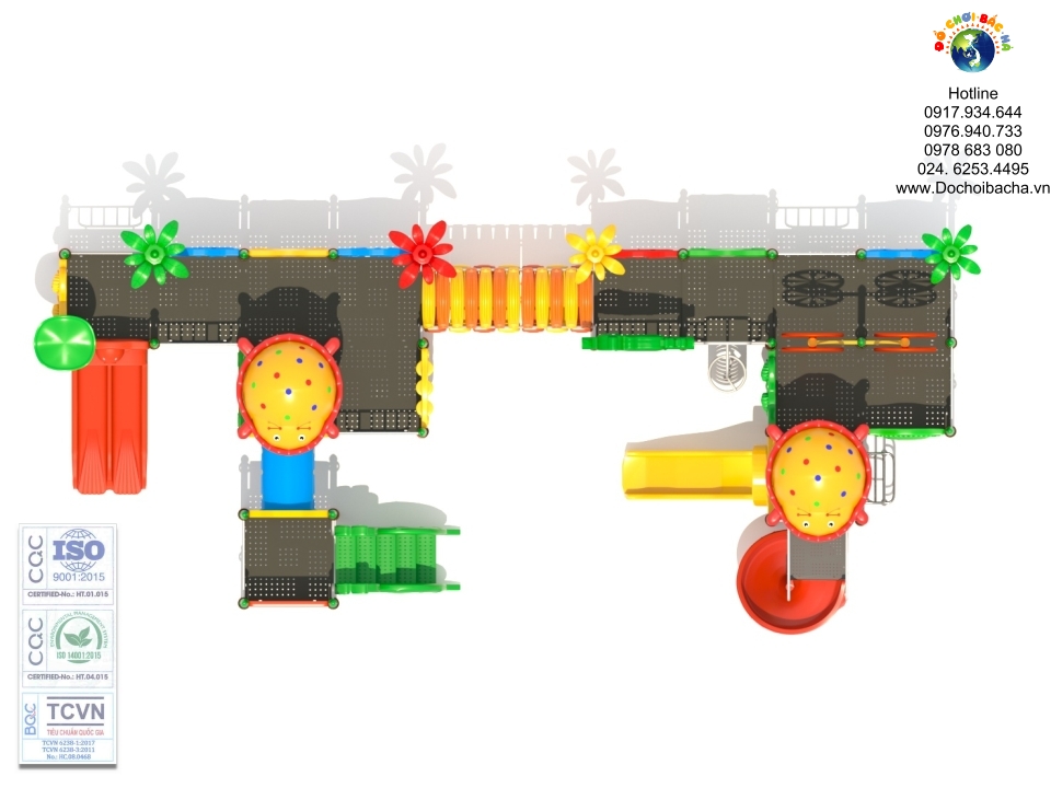 Cầu trươt ống: Cầu trượt ống có 3 màu xanh, đỏ, vàng. Chiều dài cầu trượt ống là 3,3 m, lòng ống có đường kính 60 cm. Chiều cao từ mặt đất lên sàn cầu trượt là 1 m.