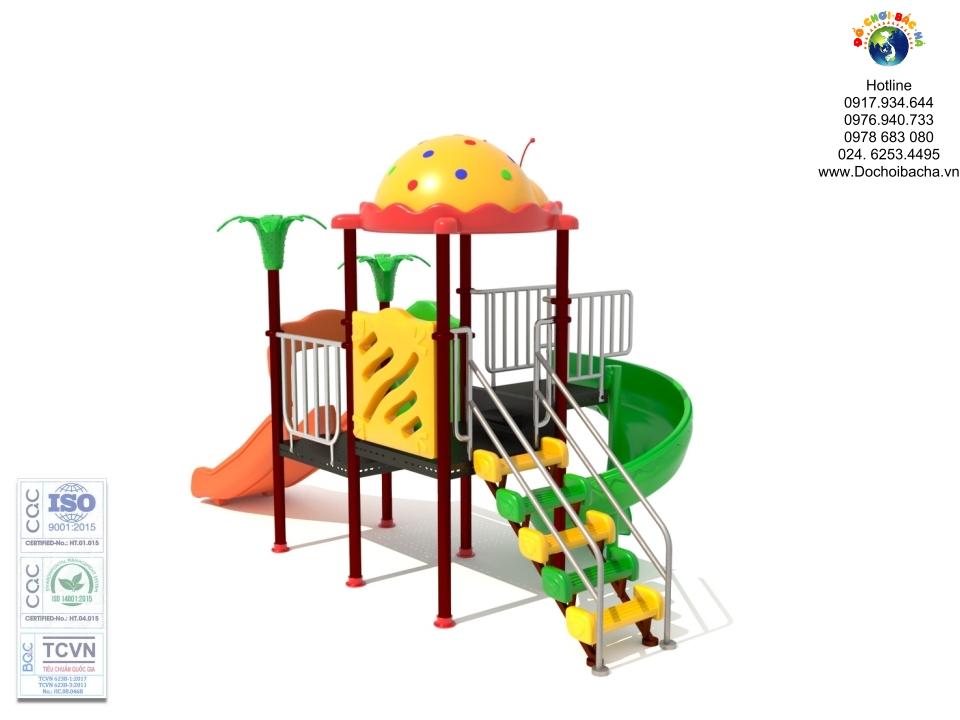 Cầu trượt xoắn: Là cầu trượt dạng xoắn ốc có trụ sắt dày bên trong và được bắt vít xuống nền bê tông chắc chắn đảm bảo không sê dịch khi trẻ chơi. Chiều cao từ mặt đất lên sàn là 1,4 m .