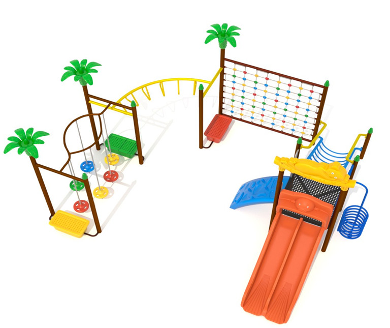 Các chi tiết cầu trượt đôi, vách leo cong, bục chữ nhật, bục tròn, phụ kiện con khỉ, hoa được làm bằng nhựa LDPE đúc liền khối màu sắc đa dạng . Cột trụ làm bằng ống thép f90 dày 1.8mm mạ kẽm sơn tĩnh điện ngoài trời.  |